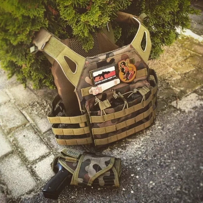 The holster is made of nylon. Thanks to the use of hooks&loops bands it is possible to adjust and adapt the holster to any replica. The holster has got a universal application. The adjustable thigh bands are closed with the use of buckles. It is also possible to fully unclip the straps depending on the user’s needs. The hip belt mounting strap is also equipped with a buckle which allows for a quick detachment of the holster from the belt. There is a pistol magazine pouch located on the top of the holster.