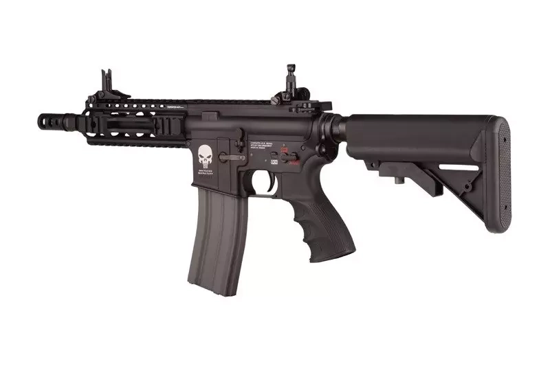 The replica is perfect for operating on a close range with a muzzle velocity of ~400 FPS. The implemented top RIS rail allows for the attachment of any optical sight, whereas an SF stock, which holds the battery, allows for adjustment of the replica to the preferences of an individual user. The set includes a kit of flip-up iron sights.