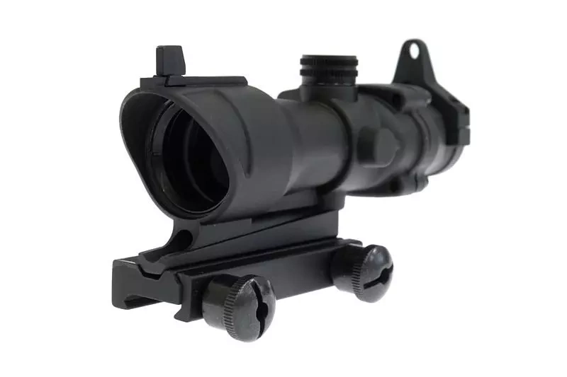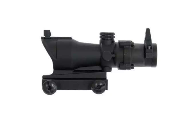 ACOG 4x32 type scope with vertically and horizontally adjustable targeting cross. Extra external sights gives chance to aim without magnification.