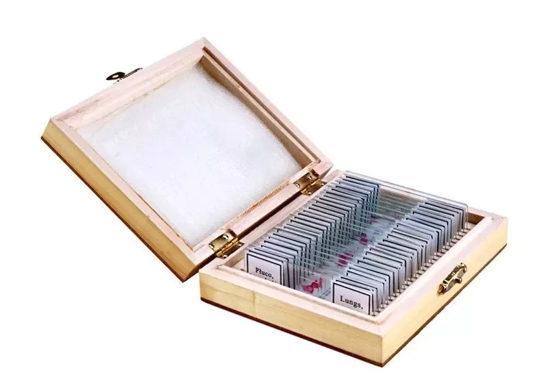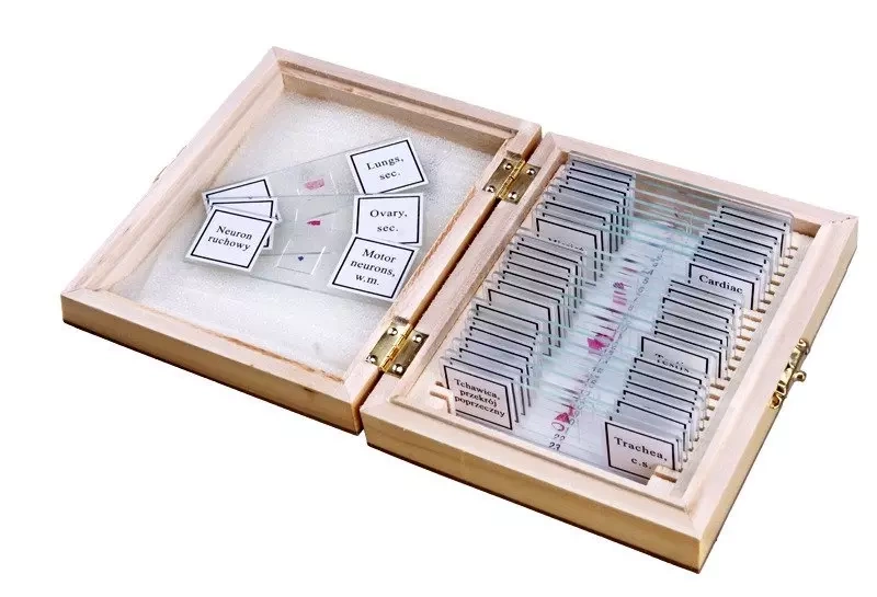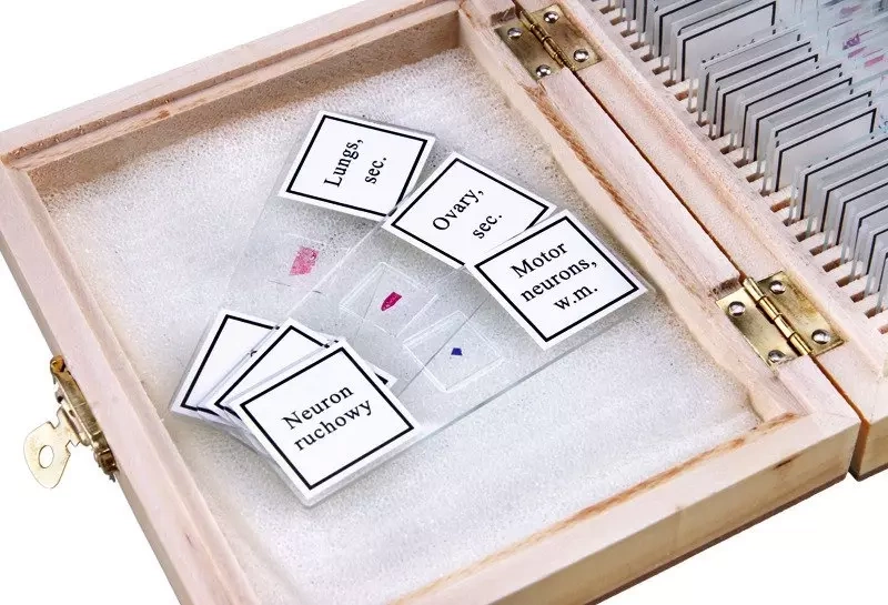They are a set of professional specimens, utilised by schools and universities. With many specimens, special contrastive reagents were used, which improve the image and bring out subtle, beautiful structures of the observed objects.