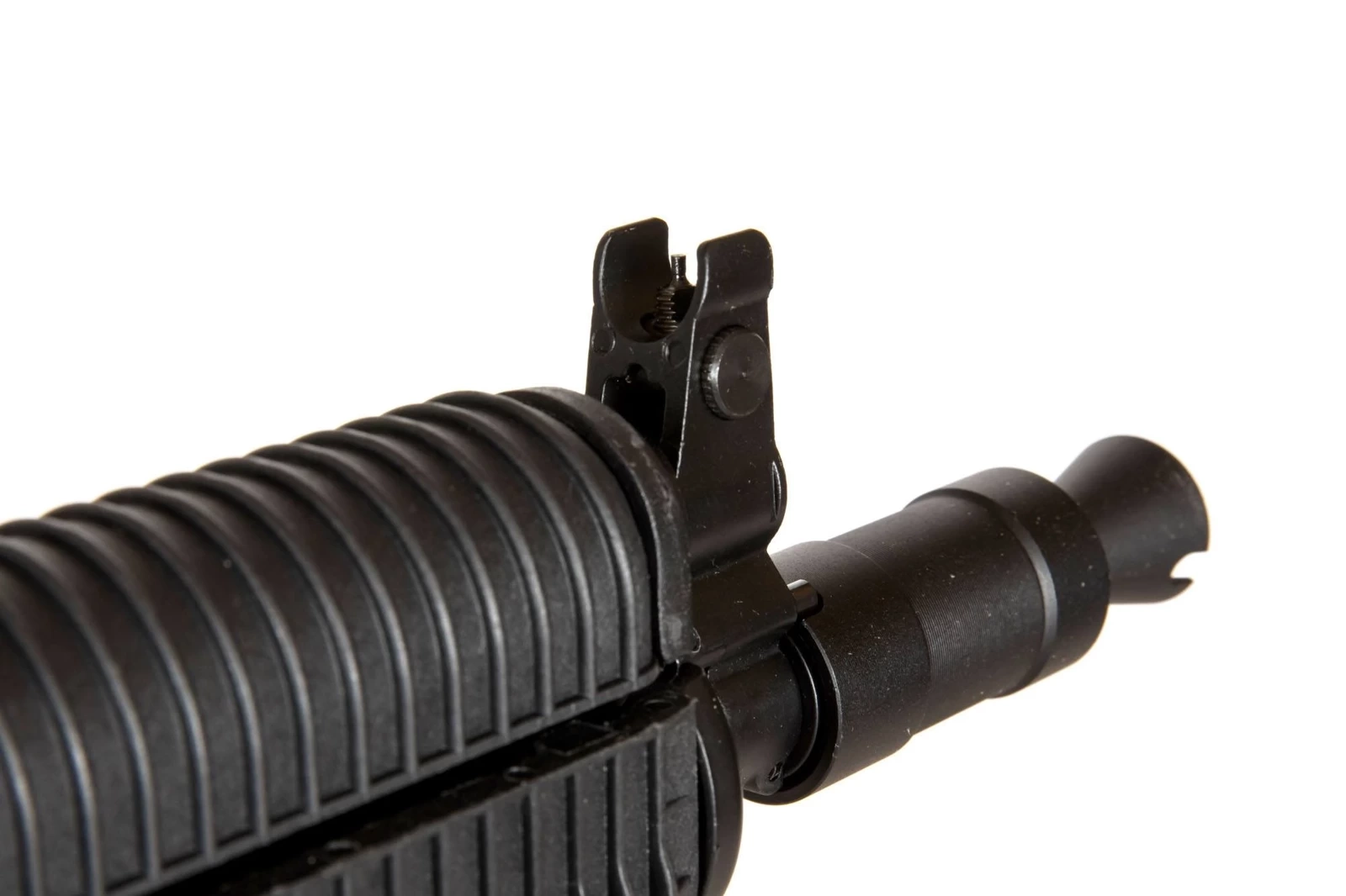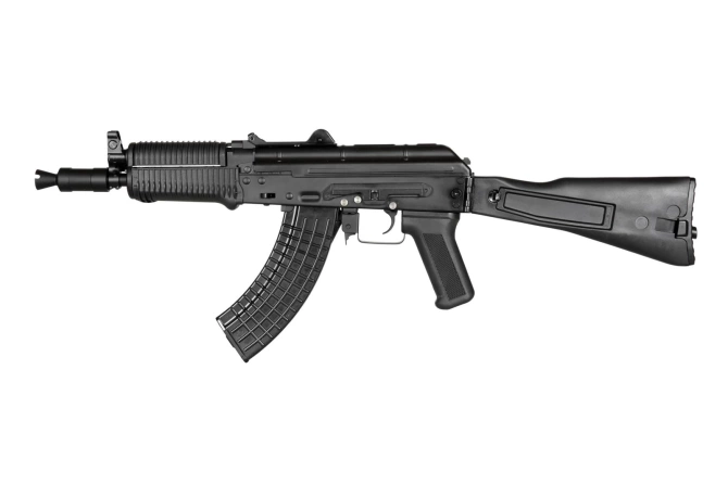 RK-01 stock folds to the side of the receiver, which allows for reduction of the size of the replica. The stick type battery is stored under the dust cover. The replica can be partially disassembled like its live firearm original. It only lacks the screws, which is a result of a construction based on the VFC standard. The receiver is equipped with a “dovetail joint” side mounting rail.