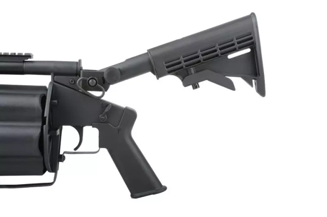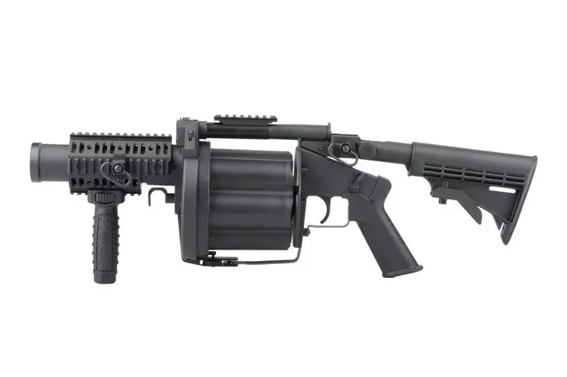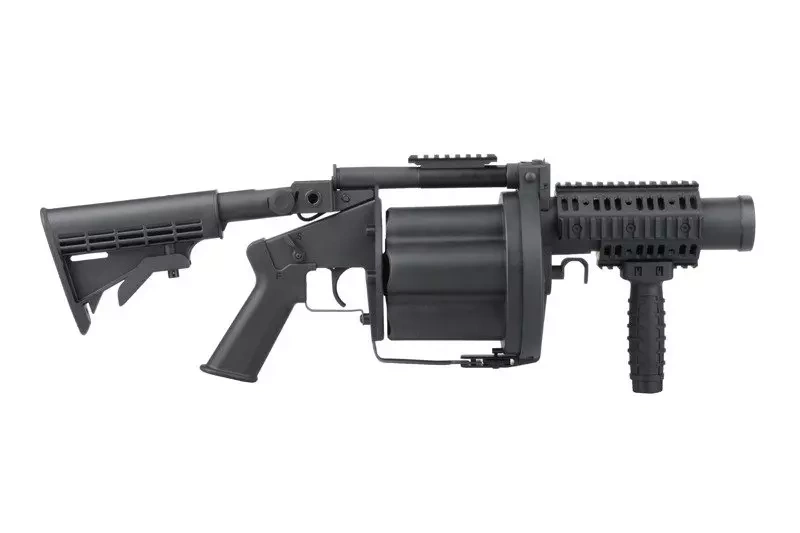 The grenade launcher is mostly made of plastic to minimise its weight, which increases significantly when loaded with 6 grenades (no grenades included). This is a revolver grenade launcher, so it has a drum magazine, and each squeeze of the trigger, in addition to tensioning the firing pin, also moves the drum one chamber. In order to make the drum rotate after each trigger pull - you must first screw the mechanism by turning the drum counterclockwise.