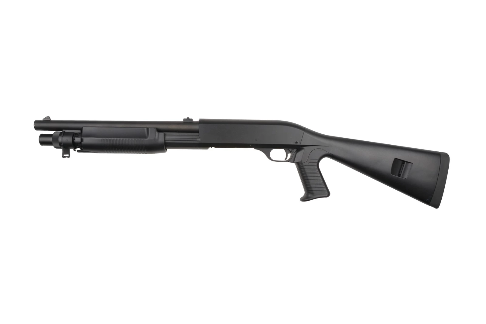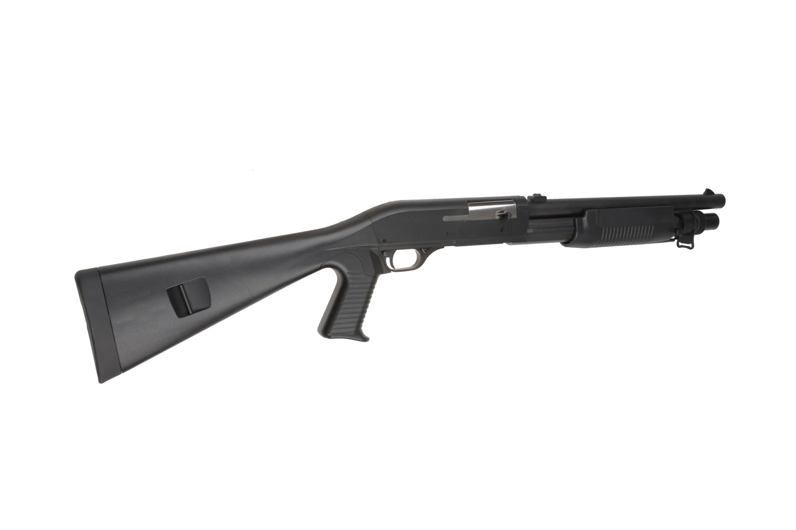 All elements of the replica fit very well together. Metal parts include the external barrel, forend slide, chamber plate, tactical sling swivels and shell ejection window plate. Remaining elements such as the pistol grip, forend, receiver and stock were made strong from polymer.
