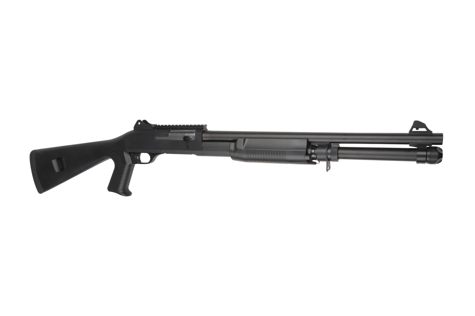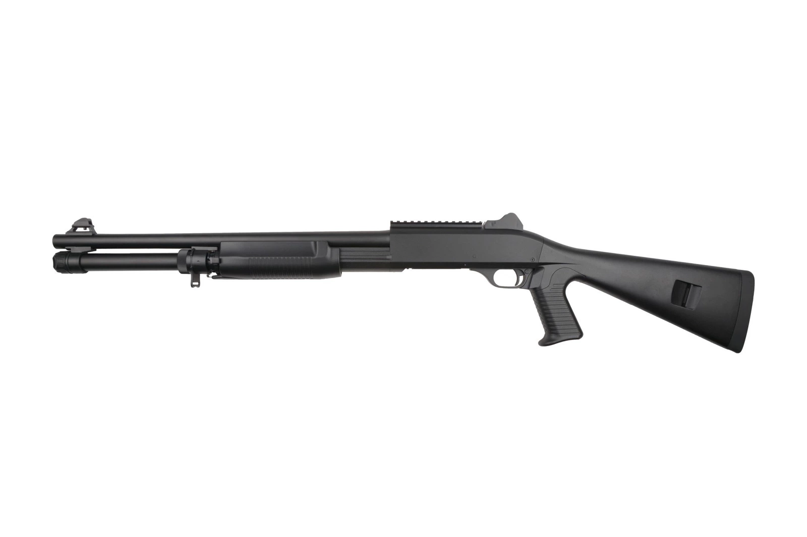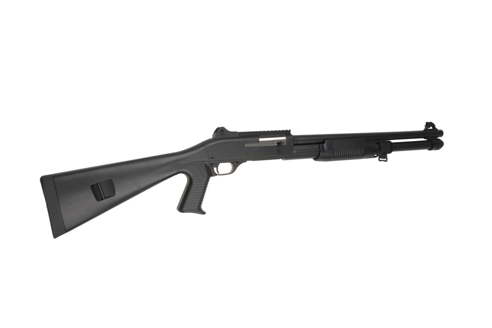 All elements of the replica fit very well together. Metal parts include the external barrel, forend slide, chamber plate, tactical sling swivels and shell ejection window plate. Remaining elements such as the pistol grip, forend, receiver and stock were made strong from polymer.
