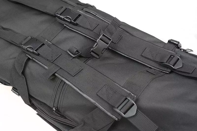 The gun bag is made of nylon. Thanks to the application of the additional sleeve the cover will without any problem hold a gun that is up to 1300mm long. Inside of the main chamber there are two additional gun mounting bands. Inside the front 620x260mm big pocket we will fit a machinegun. The gun mounting bands are also located in it.