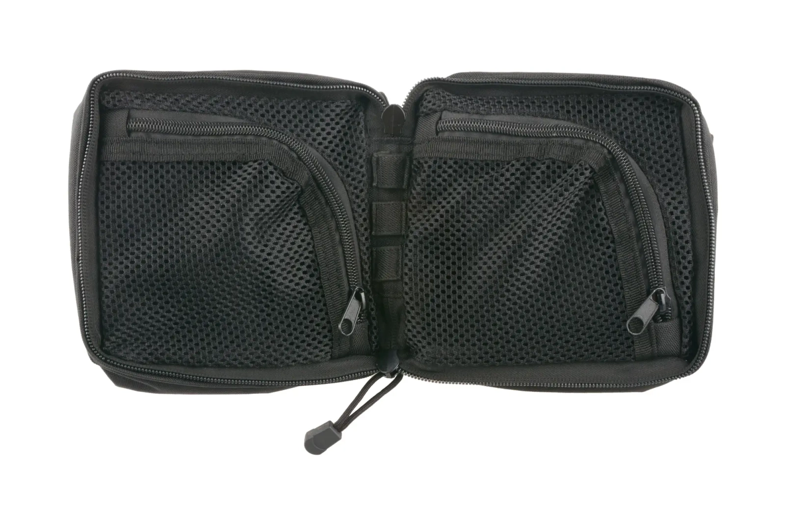 The pouch has a double zipper and can be undone to the very bottom, which allows for rapid and easy access to all of its contents. Organization of contents is facilitated by two mesh pockets with zippers containing additional rubber mounting straps. The pouch’s construction is very universal, which makes it fit for both a medical pouch and an EDC pouch.