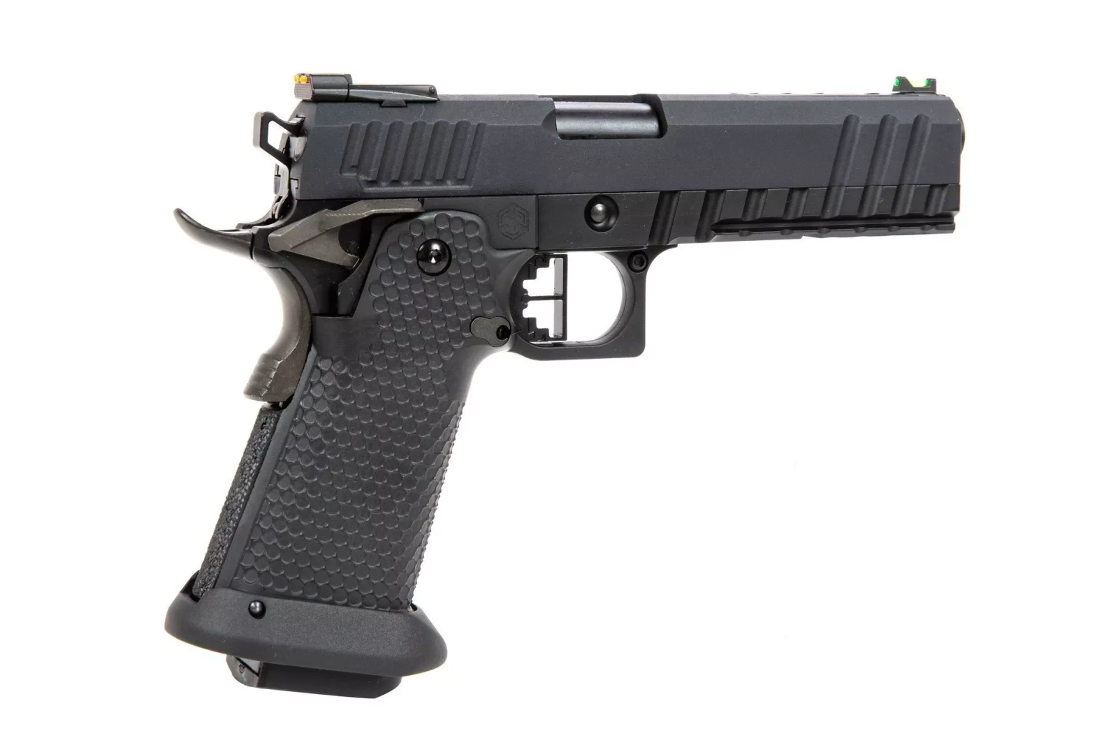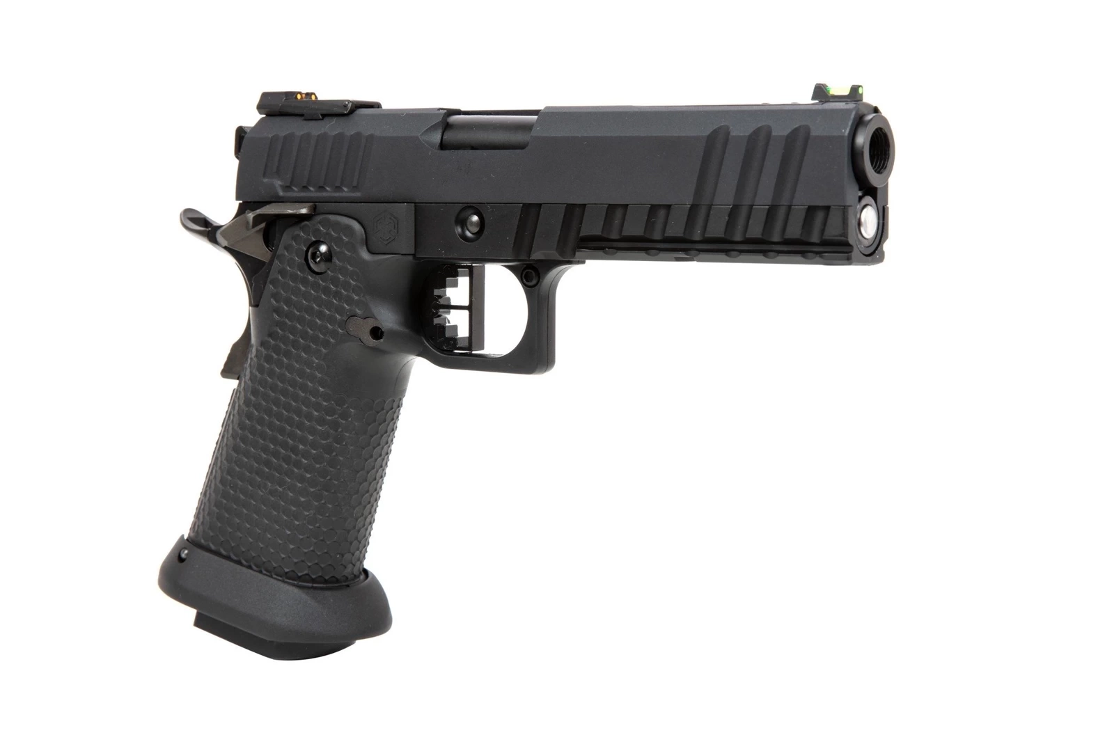A custom pistol gas replica that as a base uses a proven since 1911 construction. The entire frame of the pistol together with the slide was made from high quality metal, however, the profiled pistol grip side panels were made from a durable polymer. Excellent craftsmanship of the parts and their alignment guarantee problem-free and precise operation of the replica.