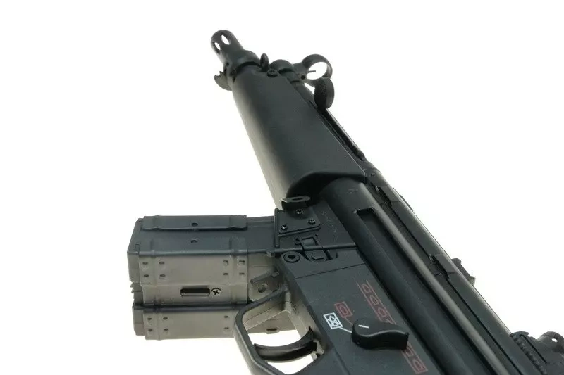 The battery is placed in the front-grip. The stock is adjustable stock allows to adjust the replica’s length to the shooter’s silhouette. The stock’s foot is covered with anti-skid material. The replica is equipped with the tactical sling attachment points that are located above the stock and in the front part of the body.