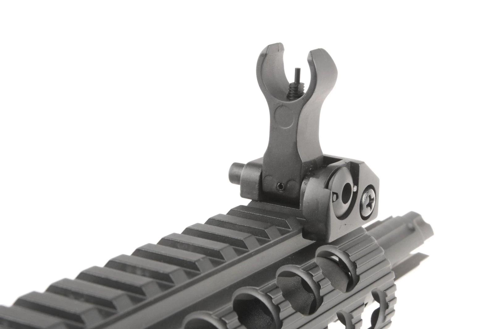 The replica is equipped with a 22 mm top RIS rail, Free Float handguard and an adjustable stock. The top RIS rail features metal flip-up iron sights, which can be freely detached in order to make room for the attachment of a chosen optoelectronic aiming device. Due to the extendable stock with an anti-slip stock pad it is possible to adapt the replica’s length to the body type and preferences of the user. Standard flash hider is based on 14 mm left-handed thread, which allows the attachment of a silencer in its place. What’s more, the set includes a silencer with a QD mount ideally fit for the handguard of the replica.