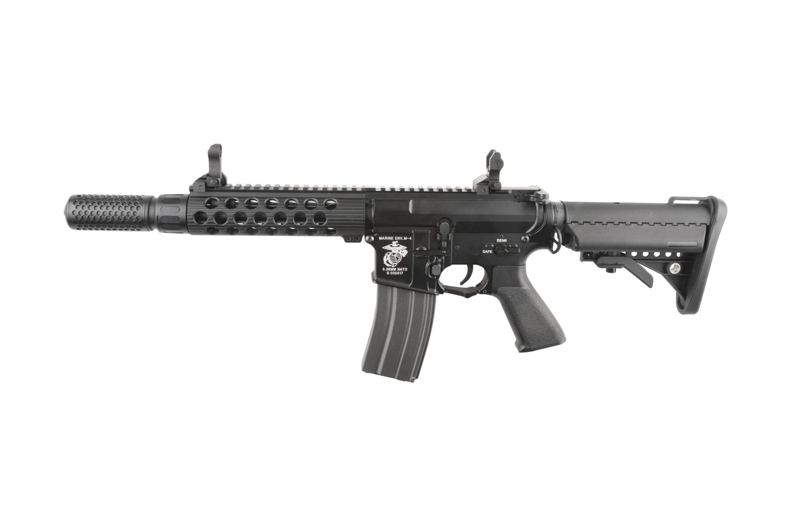 SA-K04 assault rifle replica by Specna Arms is made largely from a uniform zinc and aluminium alloy, reinforced with steel elements in the most vulnerable points of the replica (steel elements - all the screws, pins and tactical sling swivels). Both the SF stock storing the battery and the pistol grip were made from polymer. The receiver of the replica and RIS handguard have undergone the process of anodizing, which guarantees high degree of protection against corrosion. The paint was applied via a process of powder coating, after having the surface undergo the process of sandblasting prior to the application of paint. This provides a much higher than usual resistance of the applied paint to abrasion. The receiver bears USMC markings.