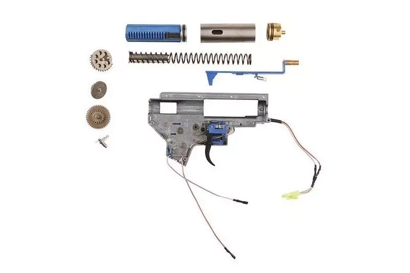 The gearbox which is reinforced on the height of the cylinder’s head hides a steel main spring guide which is the element of the Enter & Convert™ system and also 8mm ball bearings and steel thread-wheels which are placed on spacers. The system is secured with the use of four anti-reversals. There is a type 2 cylinder and the steel breaker and a metal hop-up chamber applied in this replica.