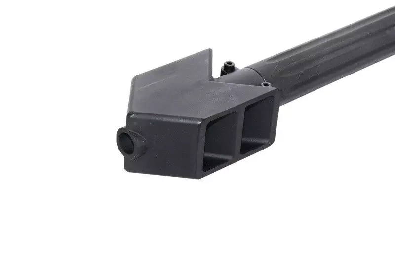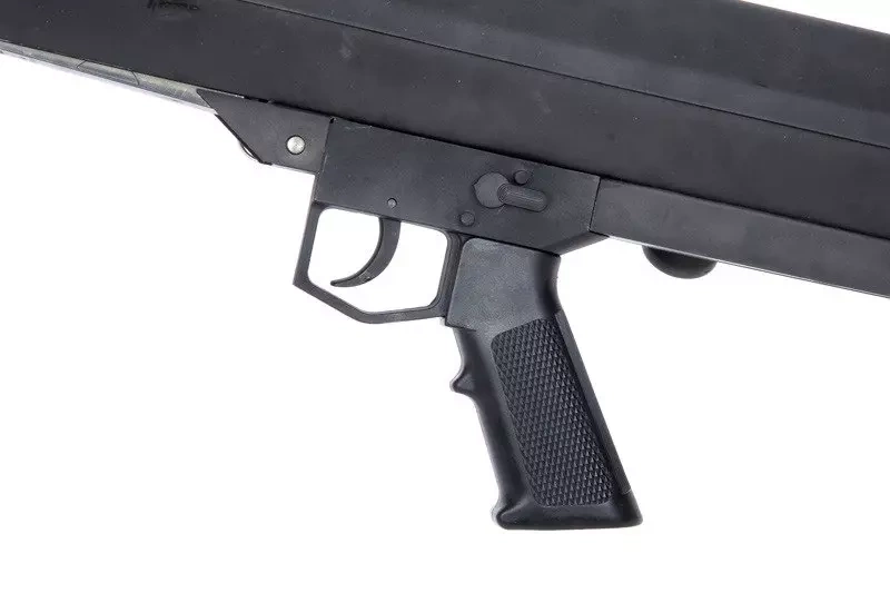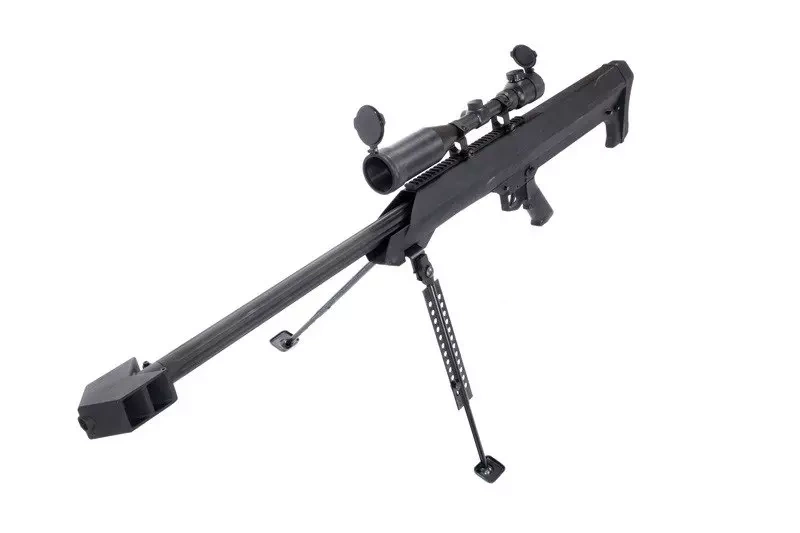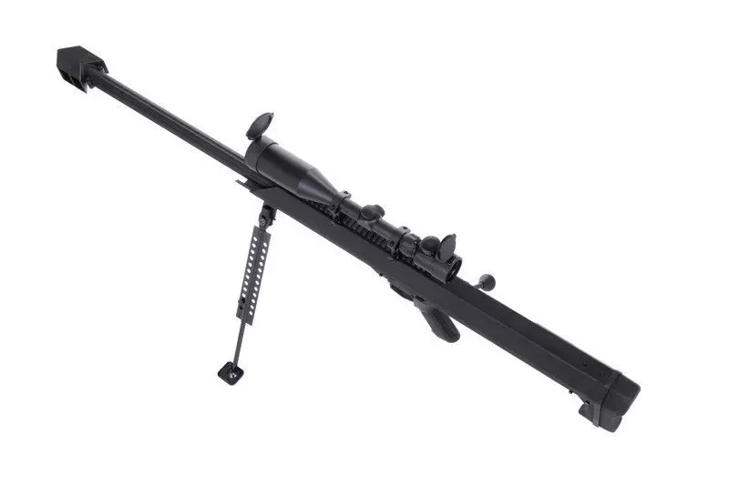 The first replica of high-caliber Barrett M99 rifle. The model was constructed of steel and metal, plastic is only pistol grip. Body replicas is made steel sheet (this represents approximately 730 mm piece of a single item!). Steel is also a multi-position folding bipod. Outer barrel with a reducer (brake) of the recoil is made of metal. Inside replica is inner barrel with length of 590 mm. Magazine holds 20 bbs, which are always need to be introduced into the chamber by pulling the bolt arrangement in 4 tacts (like most sniper rifles). On the back of the body is RIS rail with a length of 310 mm, allows for mounting additional accessories.