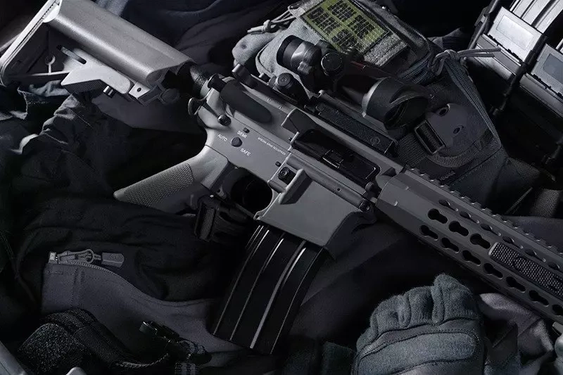 The replica is equipped with a 22 mm top RIS rail, Keymod handguard and an adjustable stock. The top RIS rail features metal flip-up iron sights, which can be freely detached in order to make room for the attachment of a chosen optoelectronic aiming device. The muzzle device is based on 14 mm left-handed thread, which allows the attachment of a silencer in its place.