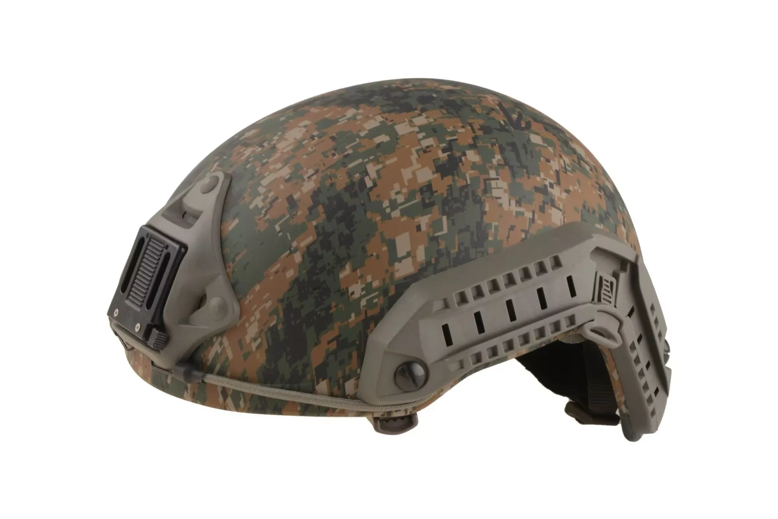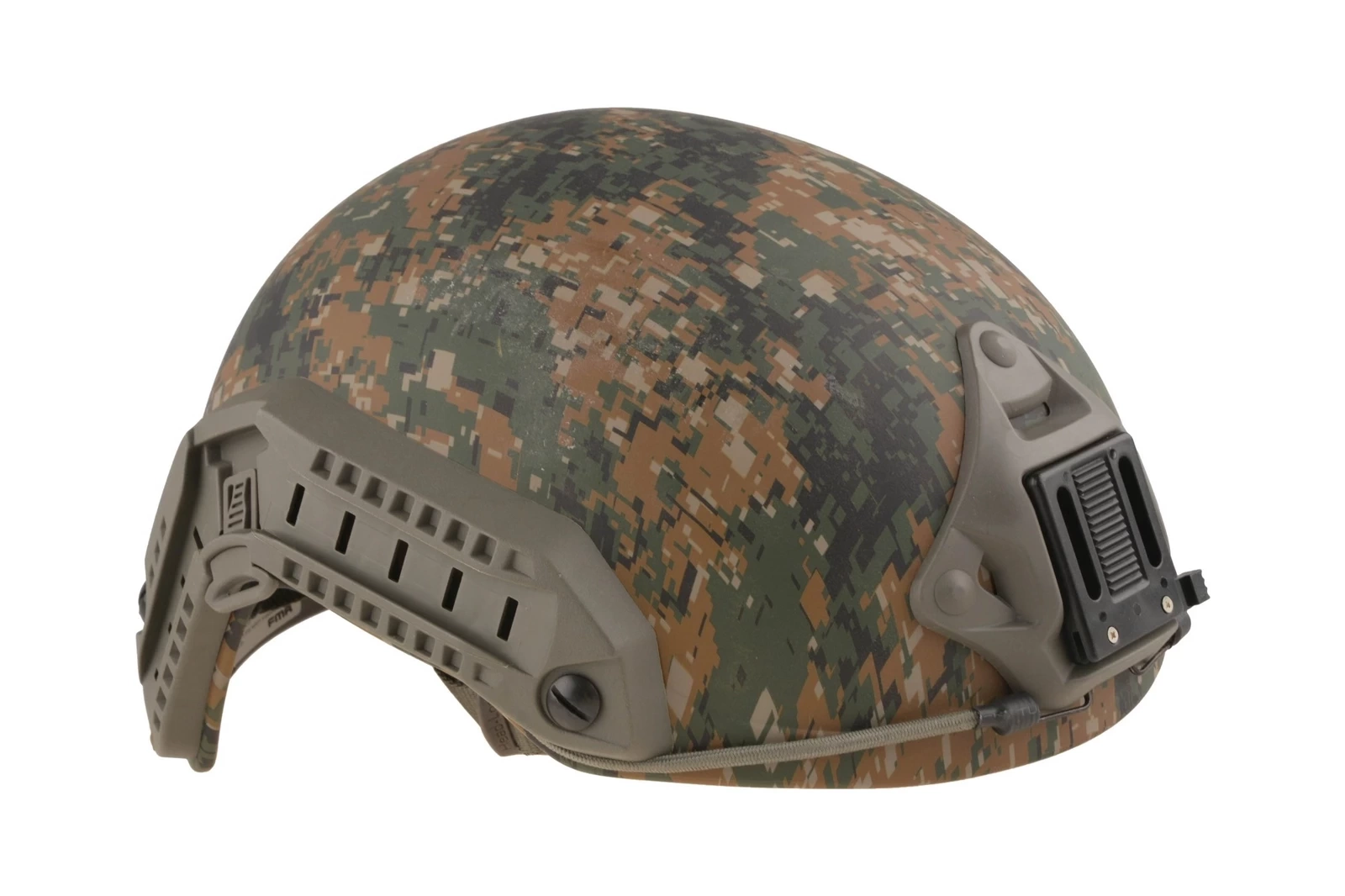 The helmet features a set of side mounting rails, which allow for mounting of a wide range of equipment like goggles, tactical flashlights, headsets, etc. On the front of the helmet is located a special mount and drawstrings for NVG systems.