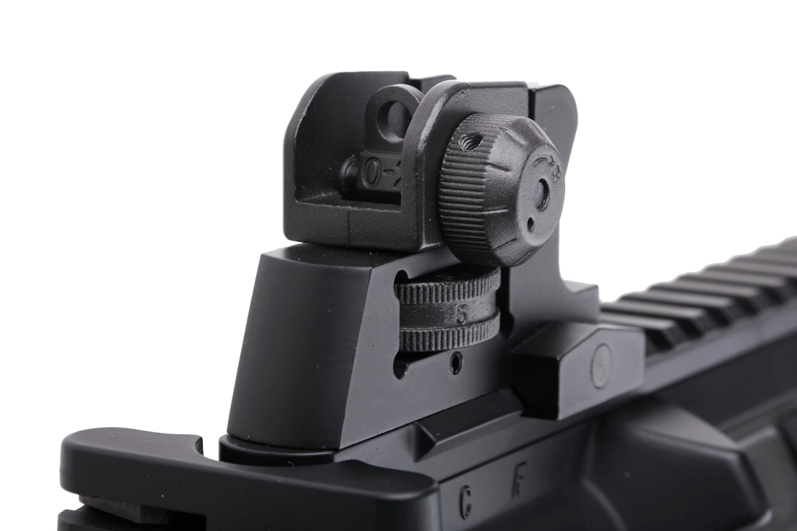 The replica features a multi-position, telescopic SF stock - featuring a thick, rubber stock pad and sockets for the attachment of a QD tactical sling. The top of the receiver features a RIS 22 mm rail and a metal, removable rear sight. The handguard features a standard RIS 22 mm rail that enables the attachment of additional accessories such as red dot sights, scopes or laser sights. The replica comes with a steel Hi-Cap magazine with a capacity of up to 300 BBs