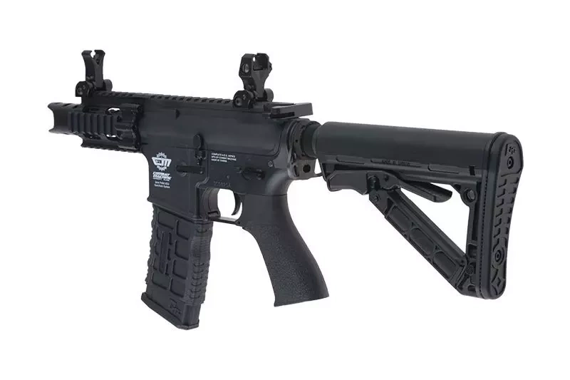Fire Hawk carbine replica by G&G made as a part of the Combat Machine project whose aim is to deliver high-quality replicas at a price that may be considered economical. Combat Machine replicas are characteristic for their highest, distinctive of G&G products, craftsmanship, reliability and high quality of materials used. The main factor that allows to reduce the price is the use of a receiver made of a high-quality polymer instead of metal. It is also important to note that the receiver was made from a fiberglass reinforced polymer - as was the pistol grip, the stock and almost all other polymer elements. Metal parts, on the other hand, include: the external barrel, stock slide, flash hider, latches and the majority of small elements.