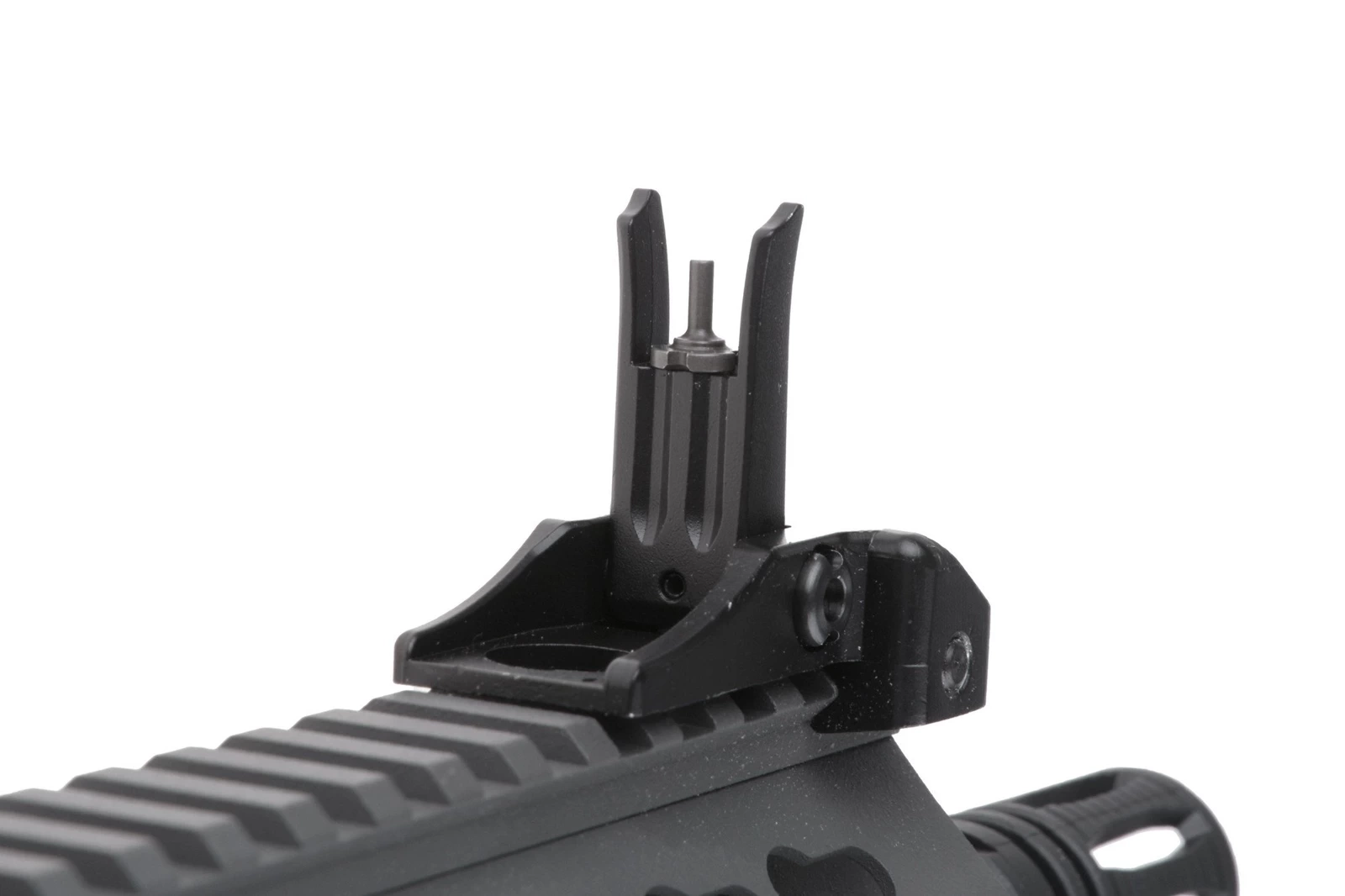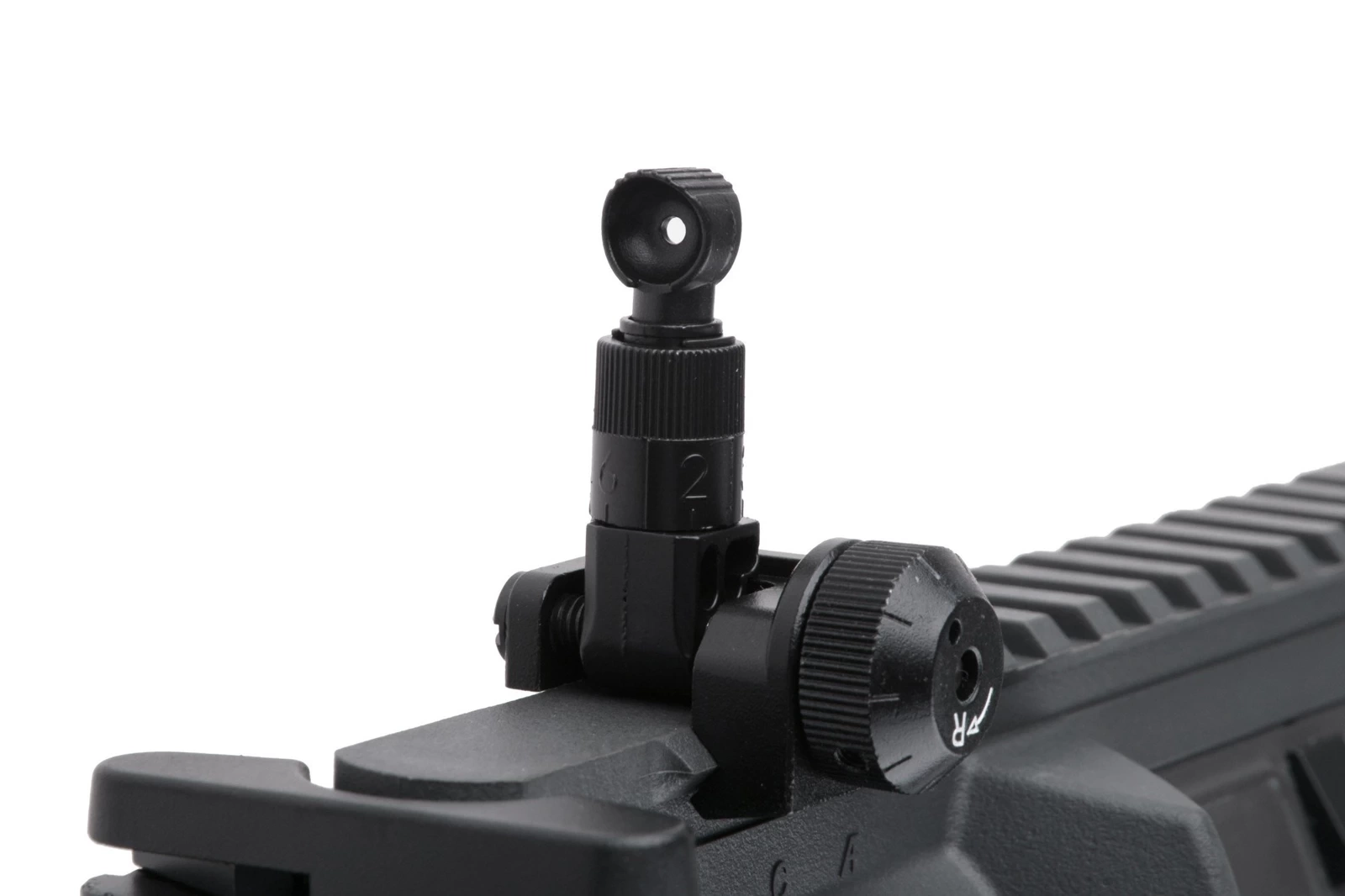 The replica features an SF stock with a rubber stock pad. Inside the stock is room for a battery. The stock is adjustable, which allows for the customization of the replica’s length to the body type and preferences of the User. The replica features a RIS 22 mm rail on top and a KeyMod handguard. The replica also features a gearbox V2 based on 8 mm bearings, which allows for achieving a muzzle velocity of ~400 FPS straight out of the box. This and the implementation of a 260 mm long outer barrel make this replica ideal for middle-ranged activities. Inside is a sealed pneumatic system, equipped with a high-quality chamber and HU bucking.