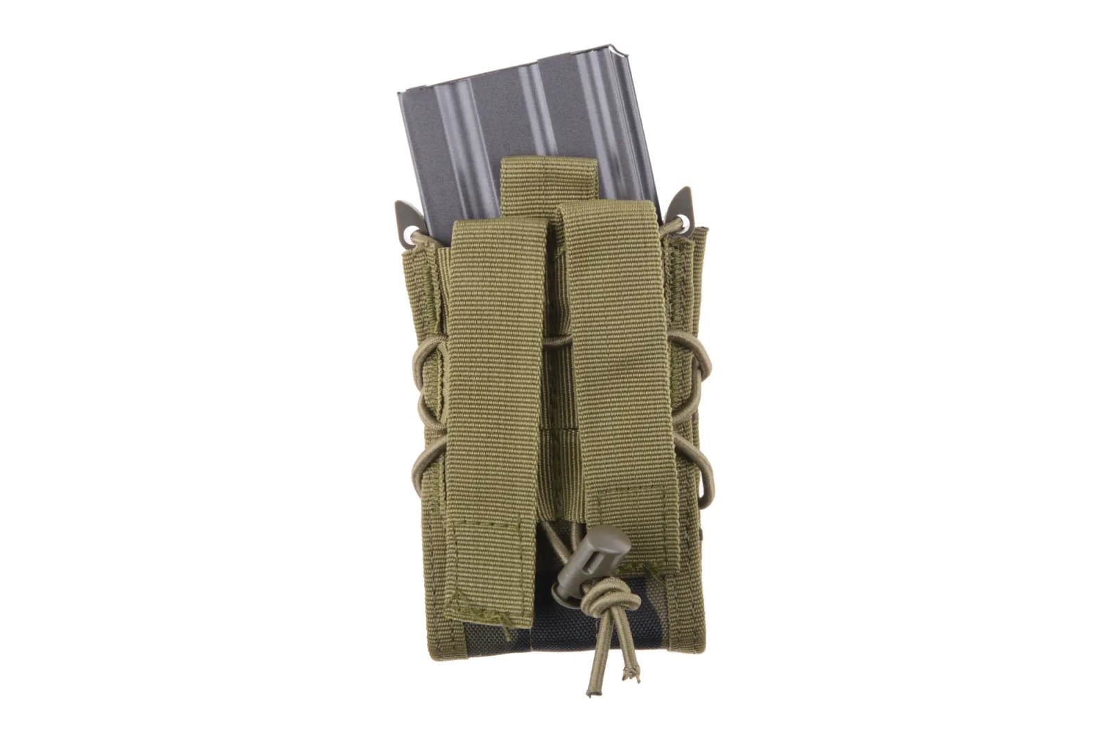 Attachable to equipment thanks to MOLLE system. The pouch does not have a traditional flap, which allows for a rapid access to the magazine itself. The magazine itself is secured in place with a rubber band as well as a special polymer safeguard, so the User does not have to worry about it accidentally falling out.