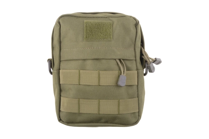 It is equipped with a mount for MOLLE webbing straps and was rubberized on the outside, which provides a limited water resistance. The front side features a small pocket with a zipper and two rows of MOLLE webbing as well as a small hook and loop fastener panel for the attachment of, for instance, a patch. On the sides of the pouch are two D-rings that enable the turning of the pouch into a small bag.