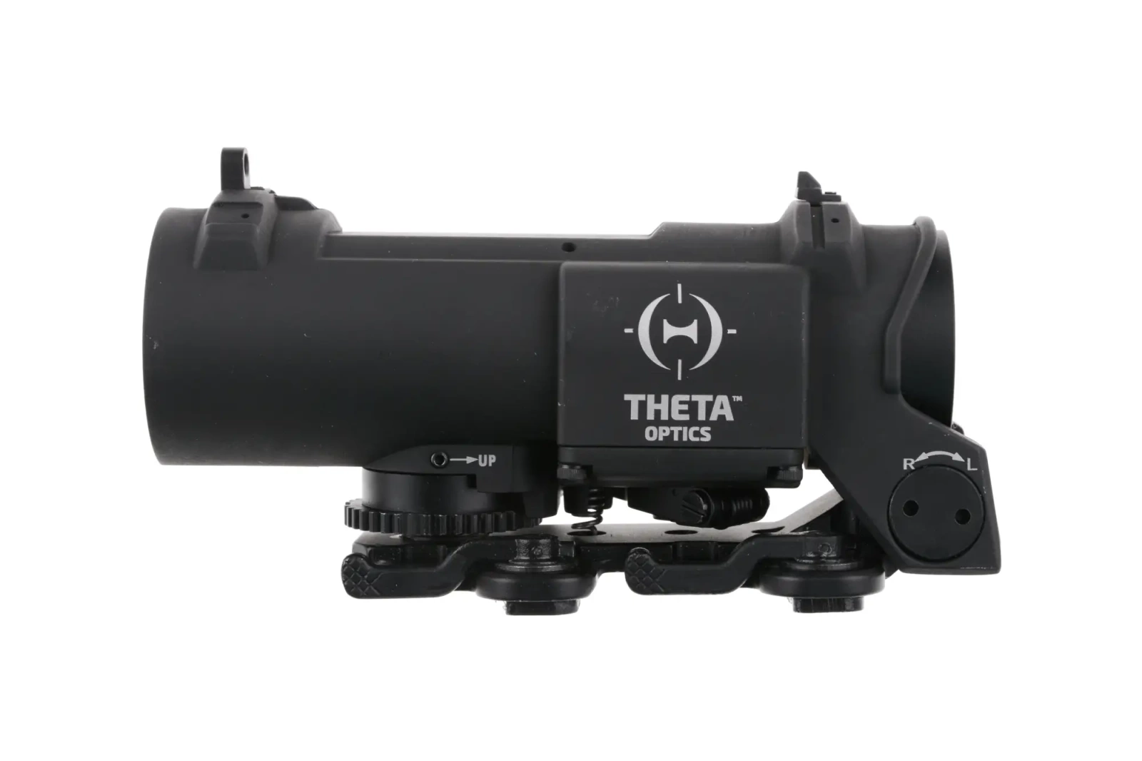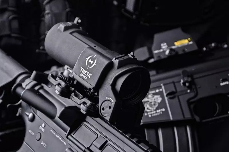 The scope replica was made of metal. Its large size (150 mm long, 70 mm high) and the material it was made of result in a weight of 595 g. The replica features a Rangefinder reticle. The sight point is located in the middle of the cross and is illuminated in red color with eleven brightness settings. The illumination is powered by a CR1620 battery. 1-4x magnification can be adjusted using a lever that is located on the left side of the scope. Due to its size, the scope features iron sights mounted on top - a front and rear sight for faster aiming.