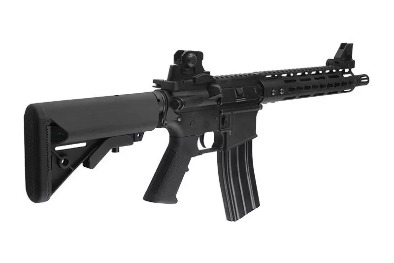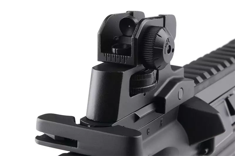 Aluminium receiver and handguard were made using CNC technology, which guarantees that elements will fit well together. The replica is equipped with a 22 mm top RIS rail and an adjustable, telescopic SF stock. The battery is stored inside the stock. The RIS rail bears metal iron sights. Their removal allows for the attachment of any optoelectronic aiming devices of choice. Standard flash hider is based on 14 mm left-hand thread, which allows the attachment of a silencer in its place. The handguard was made in KeyMod system, which allows for the attachment of any modifications. In addition, the set includes 3 additional short RIS rails compatible with KeyMod system.