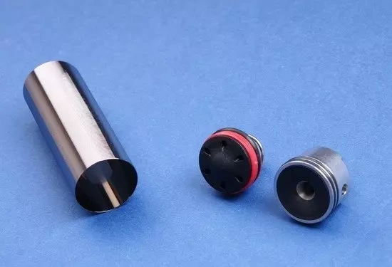 Bore Up cylinder set had bean desighn specially for AK-47/47S AEG series. Advantage of this set over standard one is greather inner diameter of cylinder, cylinder head, pistn head and air nozzle, this allow's for use of greather portion of air to be used for BB propultion. This set may be used for tuning up the power of replica without changing of the main spring.
