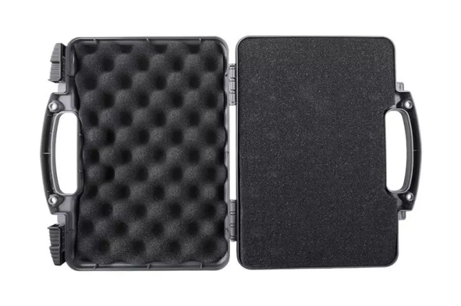 A transport case made of durable polymer measuring 310×205×80mm that allows for a safe transport of a gun.