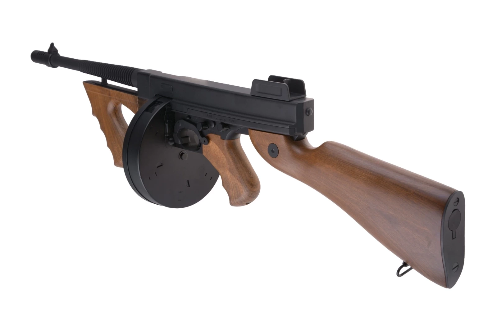 A replica of a classic American submachine gun in a “gangster” version known from movies - with a forward grip and a drum magazine. The replica was made practically entirely of metal (ZnAl). Parts that were made of wood in the original here were made of polymer with a color that perfectly imitates wood. The battery is stored inside the fixed stock and can be accessed after the removal of the stock pad. The stock and the cradle feature steel tactical sling swivels.