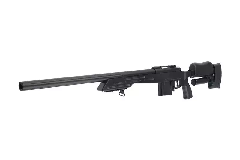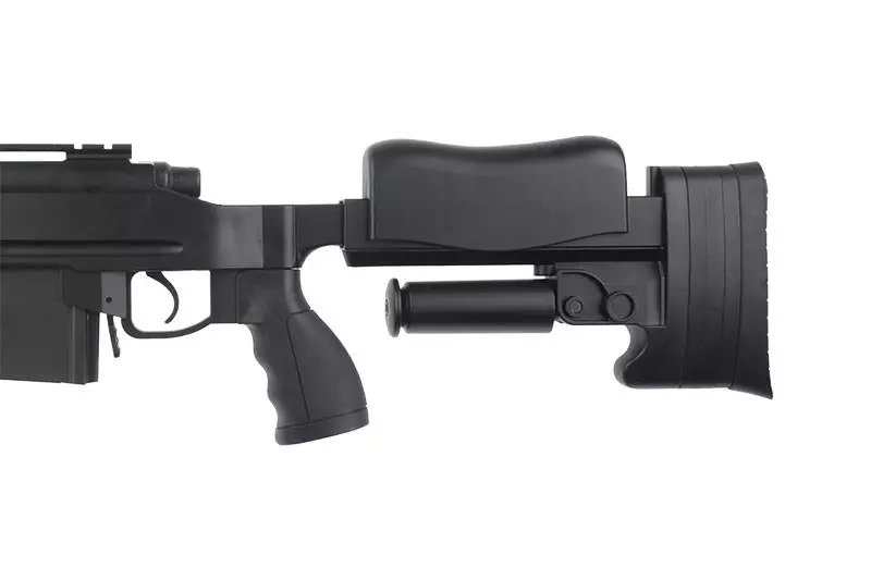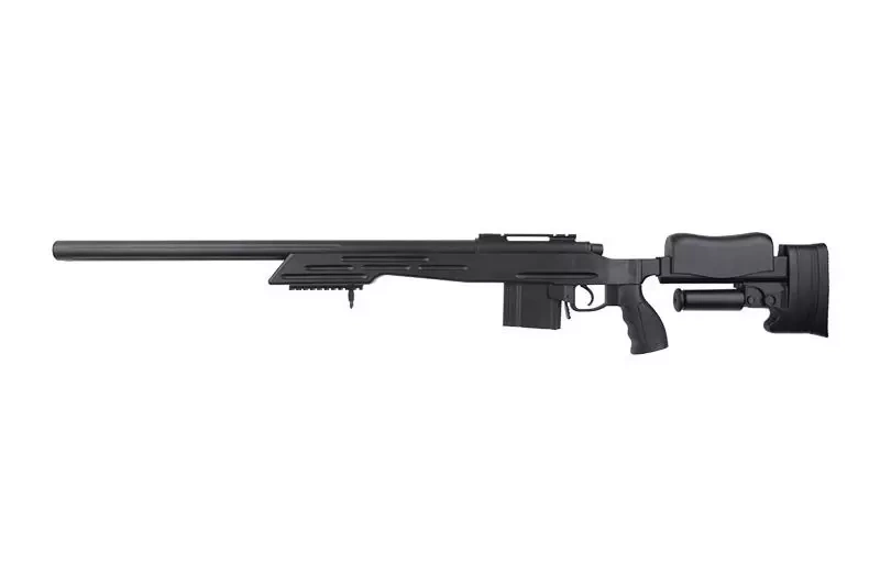 MB4413A spring-action sniper rifle replica by WELL. The internal construction is based on previous, well-known replicas from MB series. This is a bolt-action replica, which means that it needs to be reloaded every time prior to firing. The replica is made of metal and reinforced polymer. Metal parts include the massive external barrel, top RIS rail base, magazine and of course the internal mechanism with the trigger box and charging handle. Polymer parts include the cradle, pistol grip and the stock.