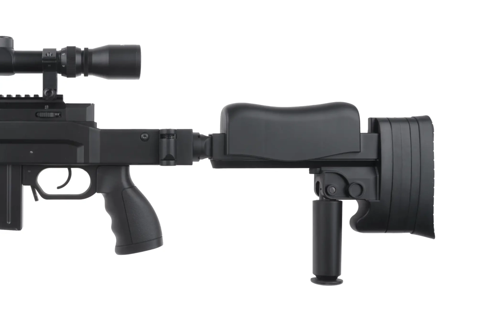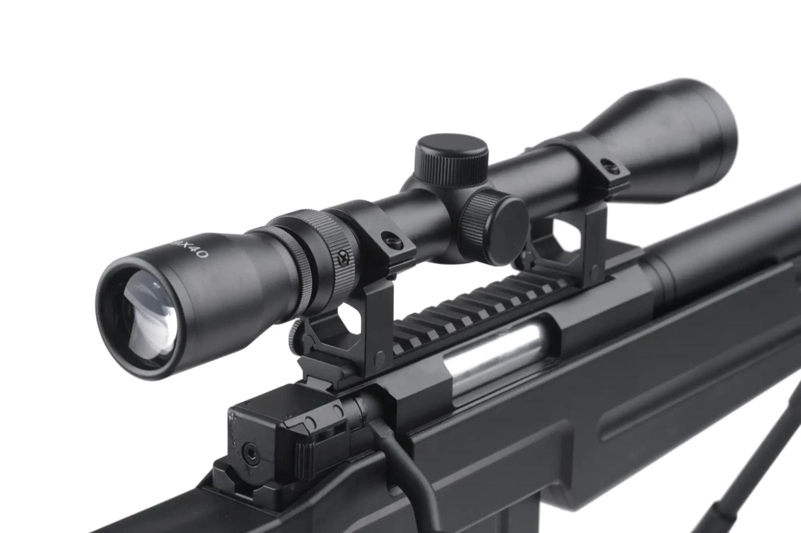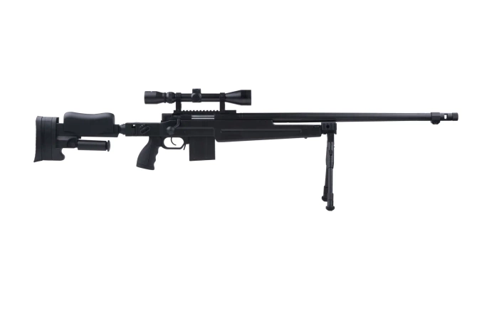 MB4414A spring-action sniper rifle replica by WELL. The internal construction is based on previous, well-known replicas from MB series. This is a bolt-action replica, which means that it needs to be reloaded every time prior to firing. The replica is made of metal and reinforced polymer. Metal parts include the massive external barrel, top RIS rail base, magazine and of course the internal mechanism with the trigger box and charging handle. Polymer parts include the cradle, pistol grip and the stock.
