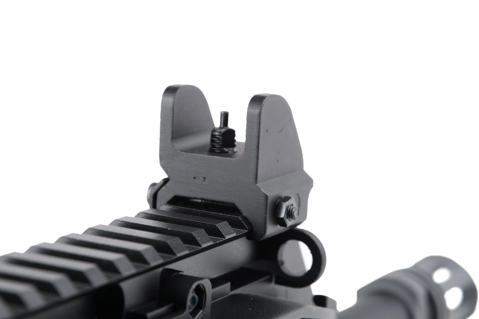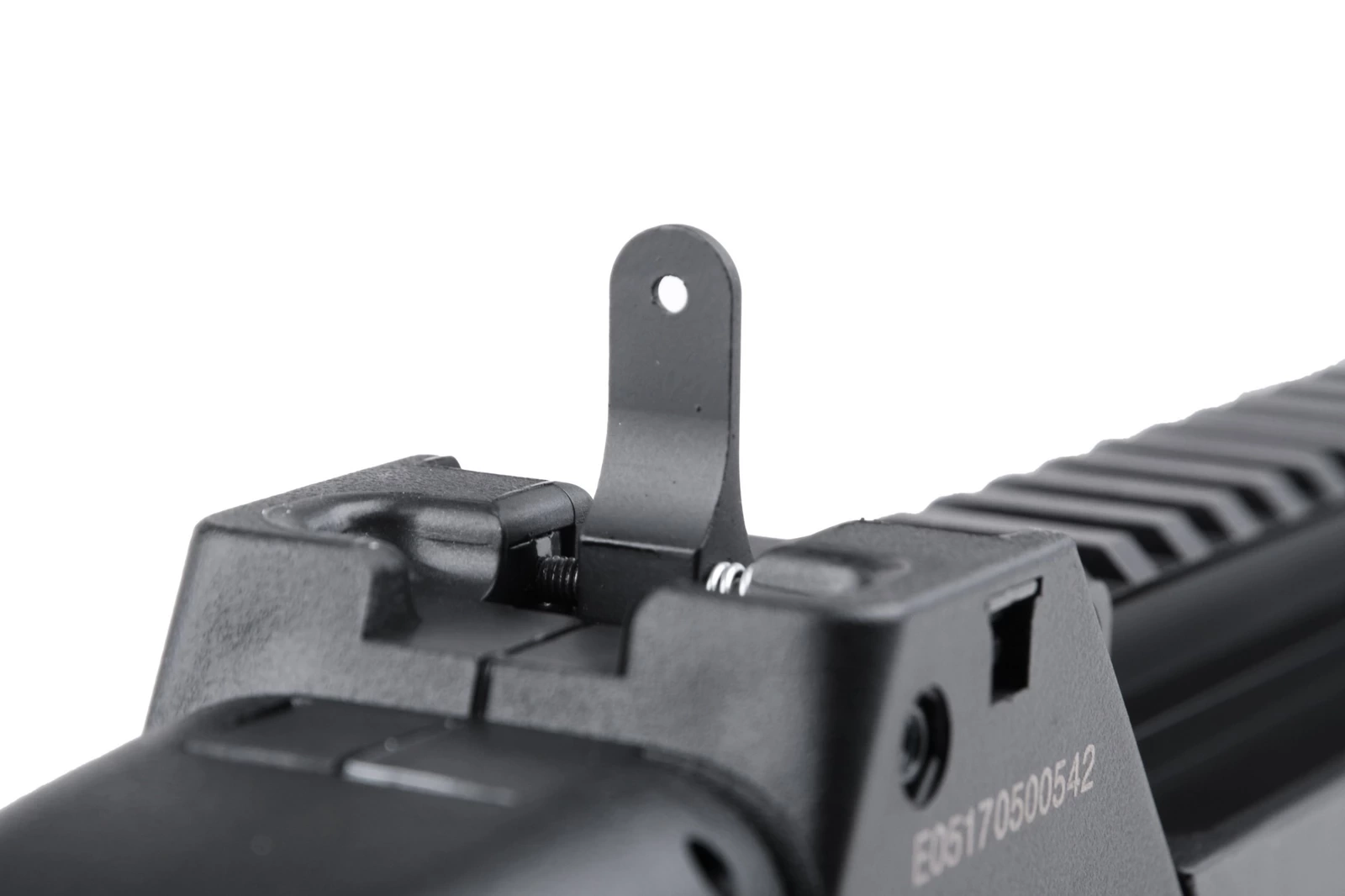 The replica was made very precisely, with the highest care for details. An excellent weight balance and the alignment of parts allows this bullpup construction to maintain a compact size and a considerable maneuverability with a fairly long internal barrel. This makes the replica suitable for games on a short and medium range. The top of the replica features also a RIS 22 mm rail, which enables the attachment of accessories such as scopes or red dot sights. The replica features iron sights. The heart of the replica constitutes a gearbox V3. The room for a battery (included in the set) is located under a rubber stock pad that can be accessed after the removal of a screw. Hop-Up chamber adjustment is conducted after opening the flap located behind the rear sight.