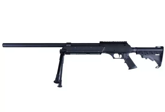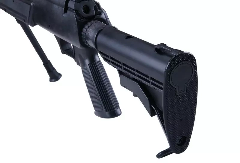 The buttstock can be adjusted in four positions. The magazine has a 20BB capacity. The set includes a bipod, which has legs adjustable in two positions: 200mm and 270mm. The barrel has a cap that can be unscrewed. Underneath it we find a 25mm clockwise inner thread that allows us to mount a suppressor.