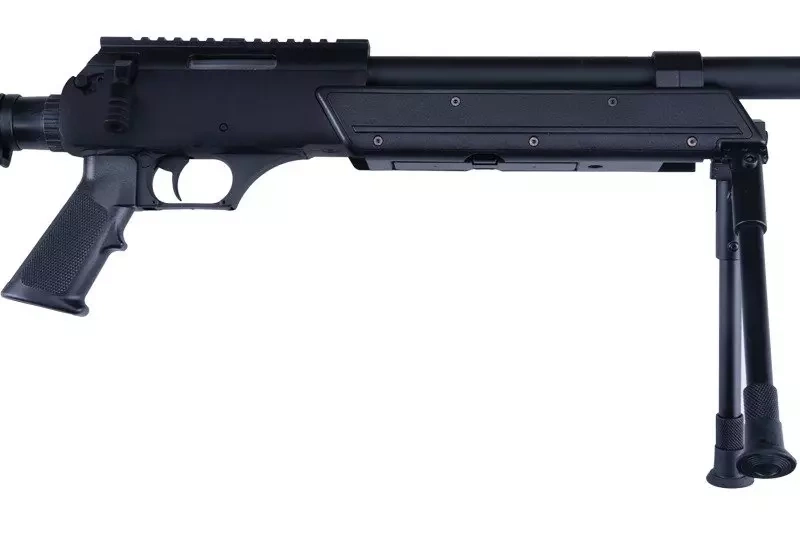 The sniper rifle airsoft gun is made from metal and ABS. The metal elements include: the barrel, the bolt handle, RIS rail and the trigger. Other elements, such as: the handguard, pistol grip, the magazine and the buttstock are made of ABS.