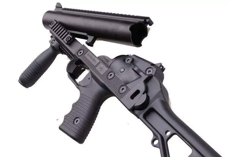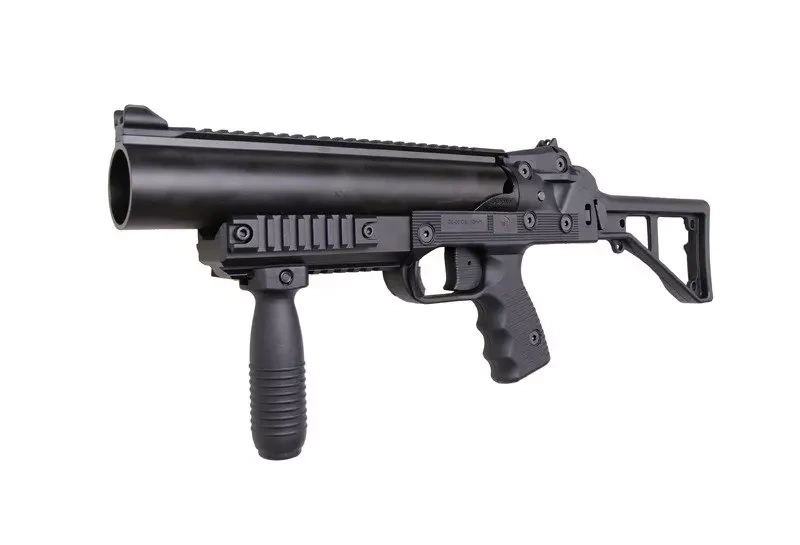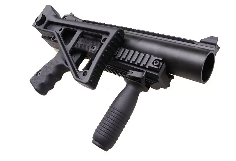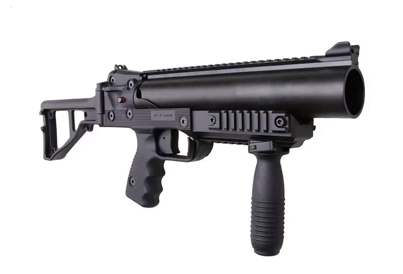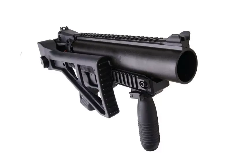 The grenade launcher replica is made of durable polymer and metal. Elements such as the barrel, bow tie and RIS rails are made of metal. The stock, pistol grip, barrel and muzzle are made of durable polymer. Thanks to the use of RIS rails, additional elements such as a torch, optical aiming devices or a tactical grip can be mounted freely. The replica has a folding buttstock, which makes it much easier to transport the grenade launcher in a rucksack or small case. The cartridge chamber of the grenade launcher has been adapted for 40mm airsoft grenades.