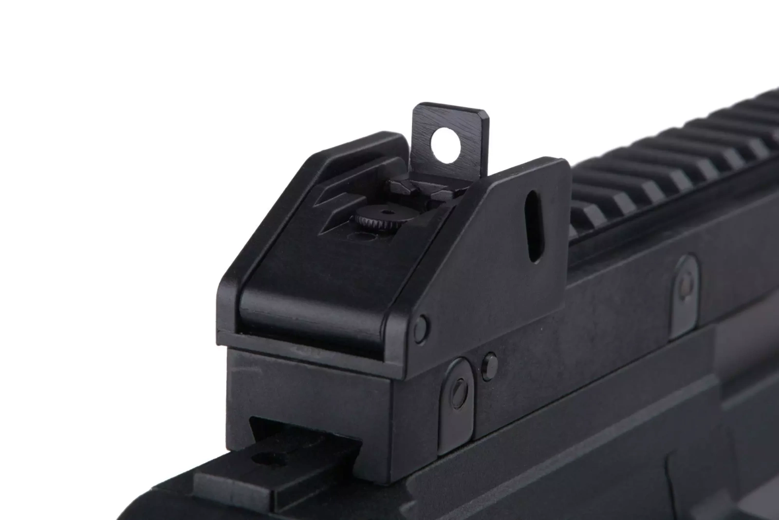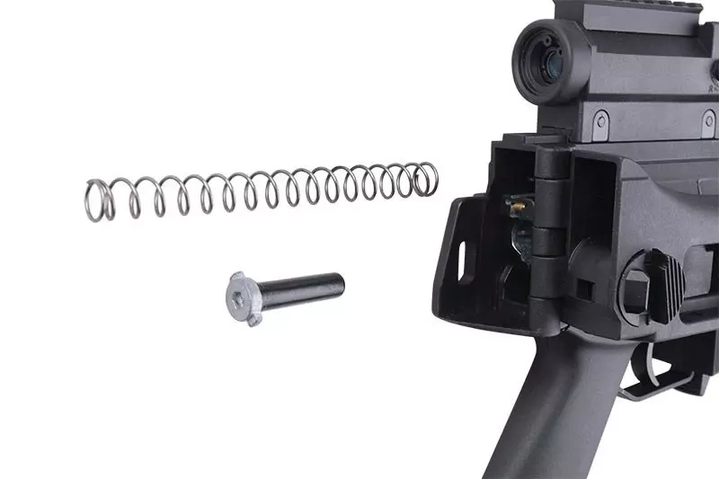 The replica is characterised by very good fit, made from an eye-pleasing matt polymer. Important components are connected by pins, in this way we can change individual elements such as the magazine slot. Made of solid polymer, the body of the replica has individual serial number, manufacturer's markings and aesthetic markings of the fire selector. The back of the replica features a classic transport grip withRIS 22mm rail as well as adjustable fixed sighting instruments. The replica has a side-folding buttstock, which facilitates transport as well as operation in tight spaces of buildings. The replica's metal barrel is finished with a flame suppressor mounted on a 14mm CW thread.