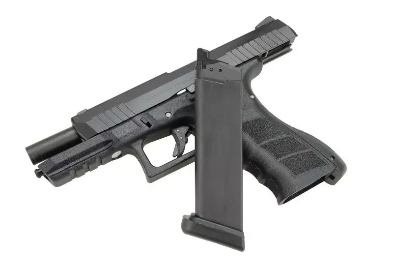 The two-row magazine holds 23 BB pellets. Due to the fact that the ATP pistol construction is based on the G17 scheme the replica can be fed by the magazines designed for it or by magazines designed for the KWA G17.