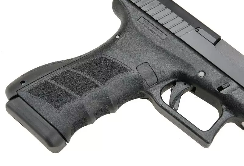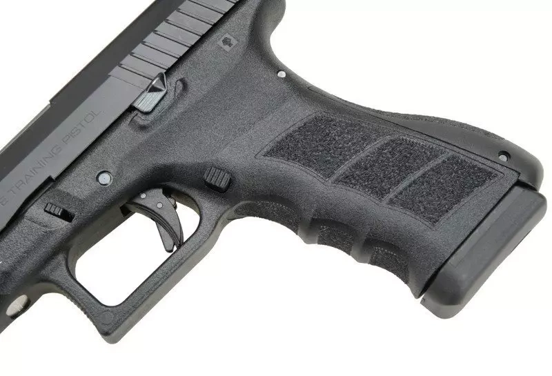 The replica is almost fully made of metal, except for the pistol grip covering panels which are made of plastic. The slide is equipped with carvings thanks to which the slide operates with the resistance met in the original firearm. Cocking the hammer allows to shorten the way of the trigger thanks to which it is possible to place an accurate and aimed shot. The hammer of a loaded pistol may be safely decocked with the help of the lever located on the left side under the magazine release lever.