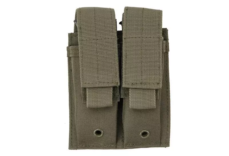 A double pistol pouch compatible with MOLLE/PALS load-bearing system that can hold two standard pistol magazines. Features a hook&loop flap closure.