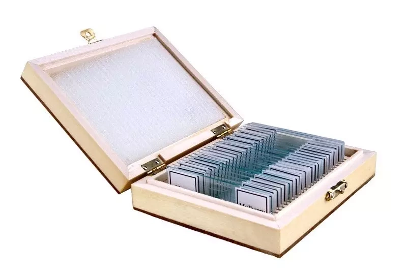 They are a set of professional specimens, utilised by schools and universities. With many specimens, special contrastive reagents were used, which improve the image and bring out subtle, beautiful structures of the observed objects.