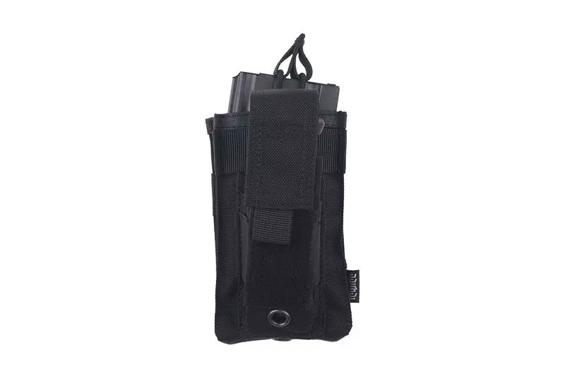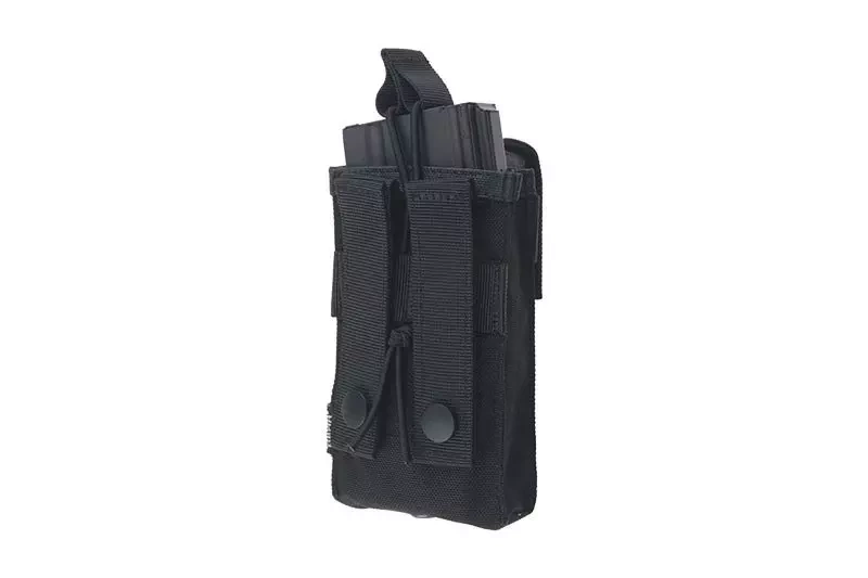 A double pouch for a single AR-15 magazine and a single 9 mm magazines made of Nylon 1000D. Larger magazines are secured from the top with an elastic shock-cord, whereas pistol magazines are secured using a flap with a hook and loop fastener.