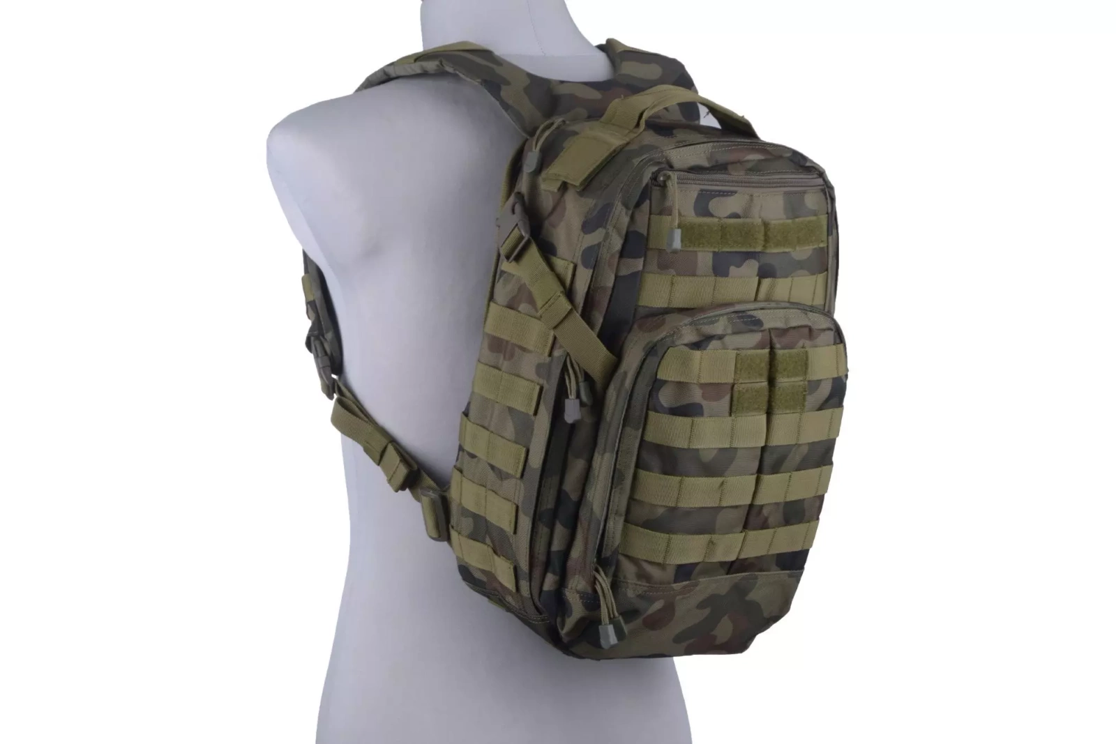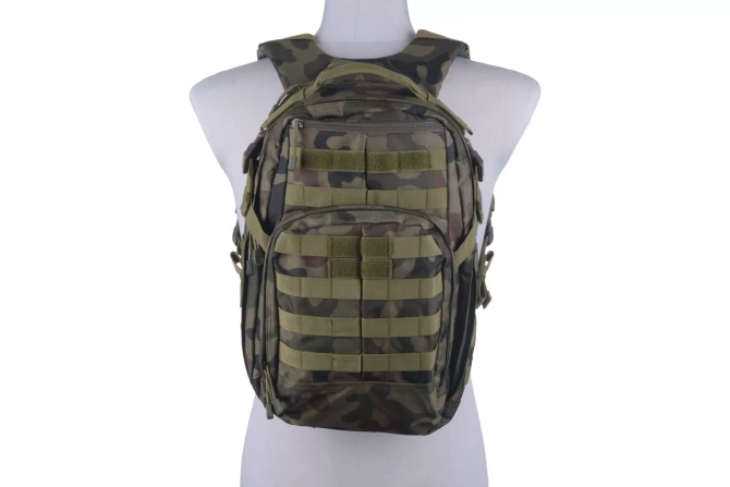 Uniwersalny plecak taktyczny typu EDC, który sprawdzi się zarówno na airsoftowym polu walki, jak i w codziennym użytkowaniu miejskim, czy na wypadzie turystycznym. Uszyty z wytrzymałego nylonu. Główna komora plecaka otwiera się na całej wysokości niczym walizka, co ułatwia pakowanie. Wewnątrz znajdziemy kieszeń na wkład hydratacyjny z zaczepami do jego zamocowania, a także dwie dodatkowe kieszenie siatkowe. Ponadto plecak posiada płaską kieszeń na plecach z wkładem usztywniającym.