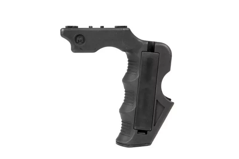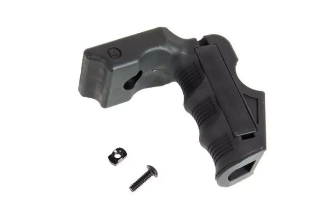 Chwyt został wykonany z wytrzymałego tworzywa sztucznego. Pasuje do replik wyposażonych w szyny montażowe systemu KEYMOD. Po bokach znajdują się punkty mocowania przycisku żelowego latarki lub wskaźnika laserowego.