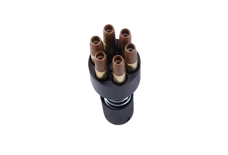 W komplecie znajduje się 6 łusek, które mieszczą po jednej kulce 6mm każda. Same łuski wykonane są z metalu oraz elastycznego tworzywa przytrzymującego kulkę.