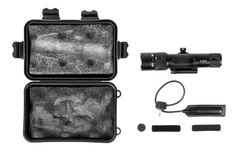 Kompaktowa latarka WMX to doskonały wybór kiedy potrzebujemy niewielkiej latarki o dużej mocy. Stanowi doskonałe uzupełnienie dla karabinków i pistoletów posiada dwa tryby świecenia - światło białym i IR. Latarka została wyposażona w standardowy montaż na szynę RIS 22mm. Sam montaż można odchylić.