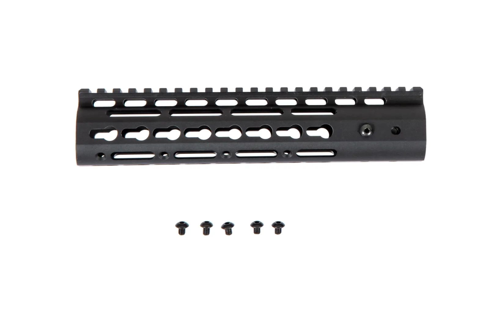 Wyposażona w system montażowy KeyMod 9", frontowa szyna RIS od marki Specna Arms. Szyna ma długość 228,6 mm i została wykonana z wysokiej jakości aluminium obrabianego na precyzyjnych maszynach CNC. Produkt dedykowany jest do mocowania w replikach typu M4/M16.
