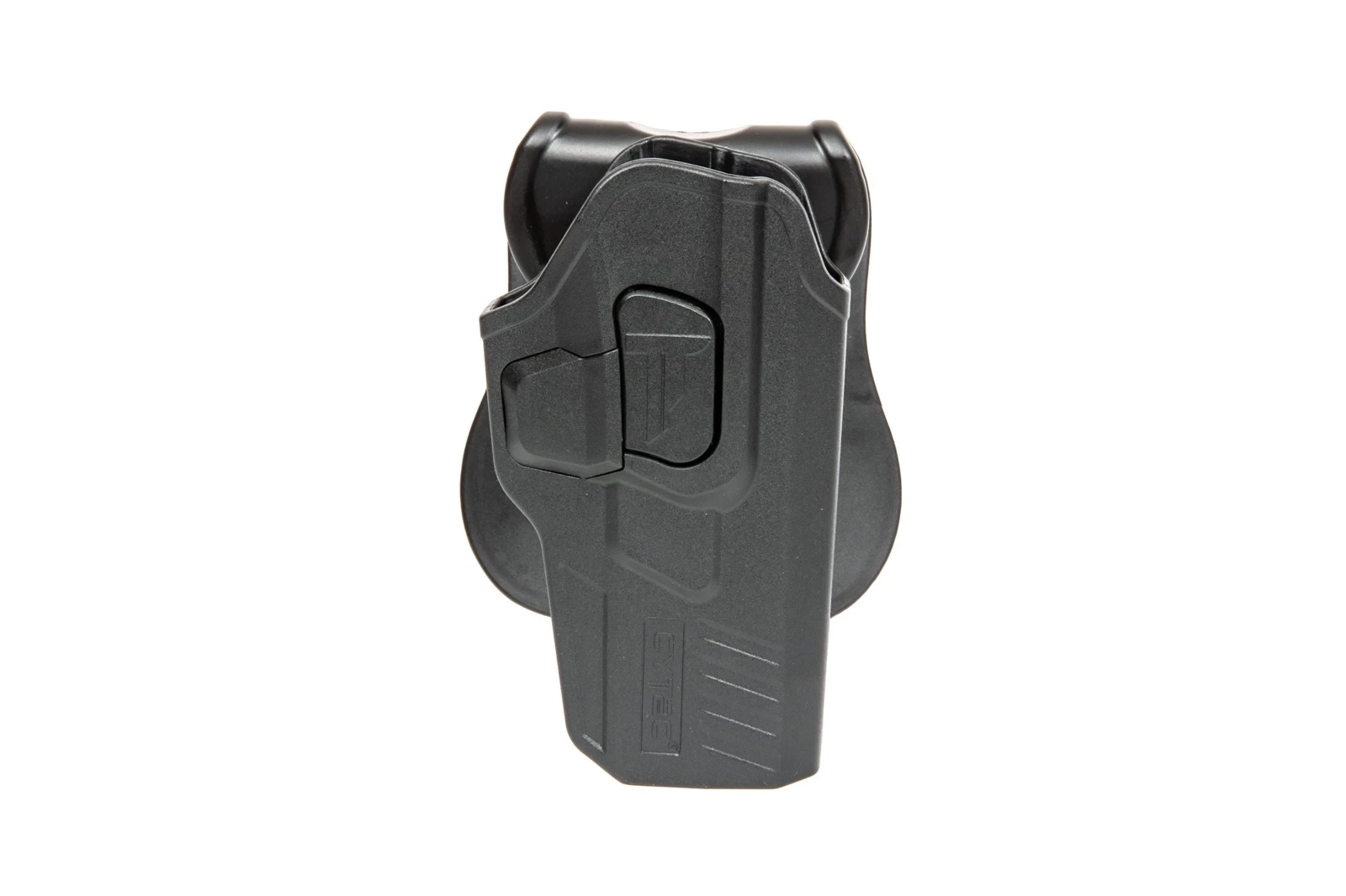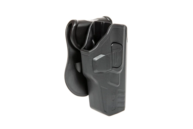 Kabura R-DEFENDER posiada intuicyjny mechanizm szybkiego zwalniania / blokowania, obsługiwany palcem wskazującym. Pistolet jest automatycznie blokowany po odłożeniu do kabury.