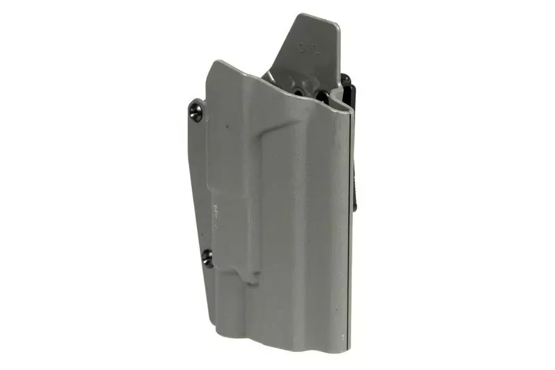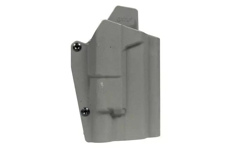 Wykonana z wytrzymałego tworzywa sztucznego przez firmę FMA kabura taktyczna przeznaczona do montażu na pasach taktycznych o maksymalnej szerokości 50mm. Do kabury pasują repliki pistoletów Glock 17L, także te wyposażone w oświetlenie taktyczne.
