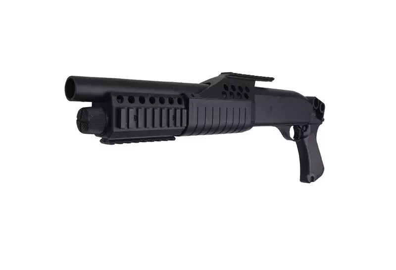 Sprężynowa wersja repliki wykonana została z bardzo wytrzymałego tworzywa sztucznego. W zestawie znajdują się cztery shellsy, do których ładujemy 6mm kulki BB. Dzięki czterem szynom RIS możemy zamontować na replice dodatkowe akcesoria, takie jak celowniki optyczne czy oświetlenie taktyczne. Specjalna ładownica, zakładana na replikę umożliwia przenoszenie trzech shellsów z kulkami w zasięgu ręki, oraz szybkie doładowanie repliki.