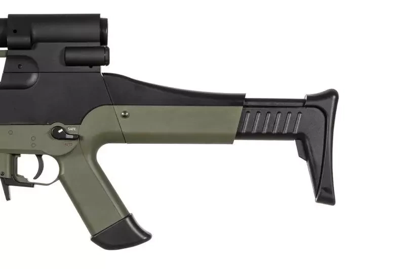Replika, w jeszcze większym stopniu niż oryginał jest oparta na G36. Futurystyczny kształt idzie w parze z bardzo wysoką ergonomią. W karabinku zamontowano standardowy celownik optyczny. Jest on demontowany i zamiast niego, możemy korzystać ze składanych, mechanicznych przyrządów. Kolba nie jest składana na bok, jak w G36, jest jednak regulowana na długość.