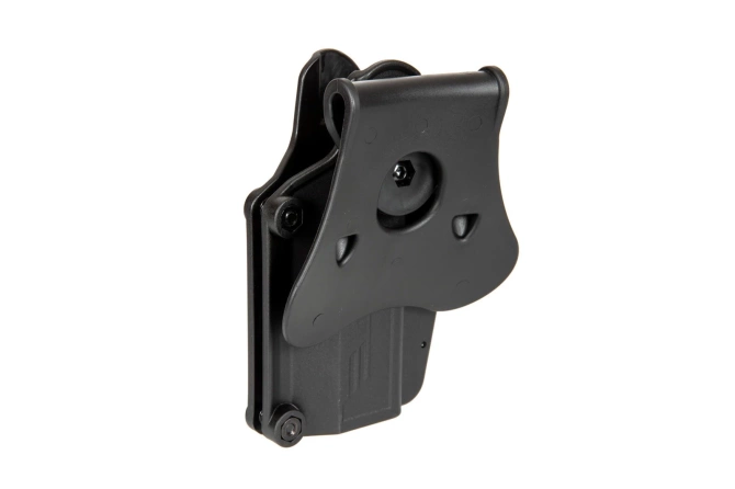Wyprodukowana z wytrzymałego polimeru przez firmę Amomax kabura uniwersalna do replik. Dzięki specjalnej konstrukcji, kabura jest kompatybilna z ponad 80 rodzajami pistoletów, w tym najpopularniejszymi jak Glock, Sig Sauer, CZ, Ruger, Beretta czy Colt 1911.
